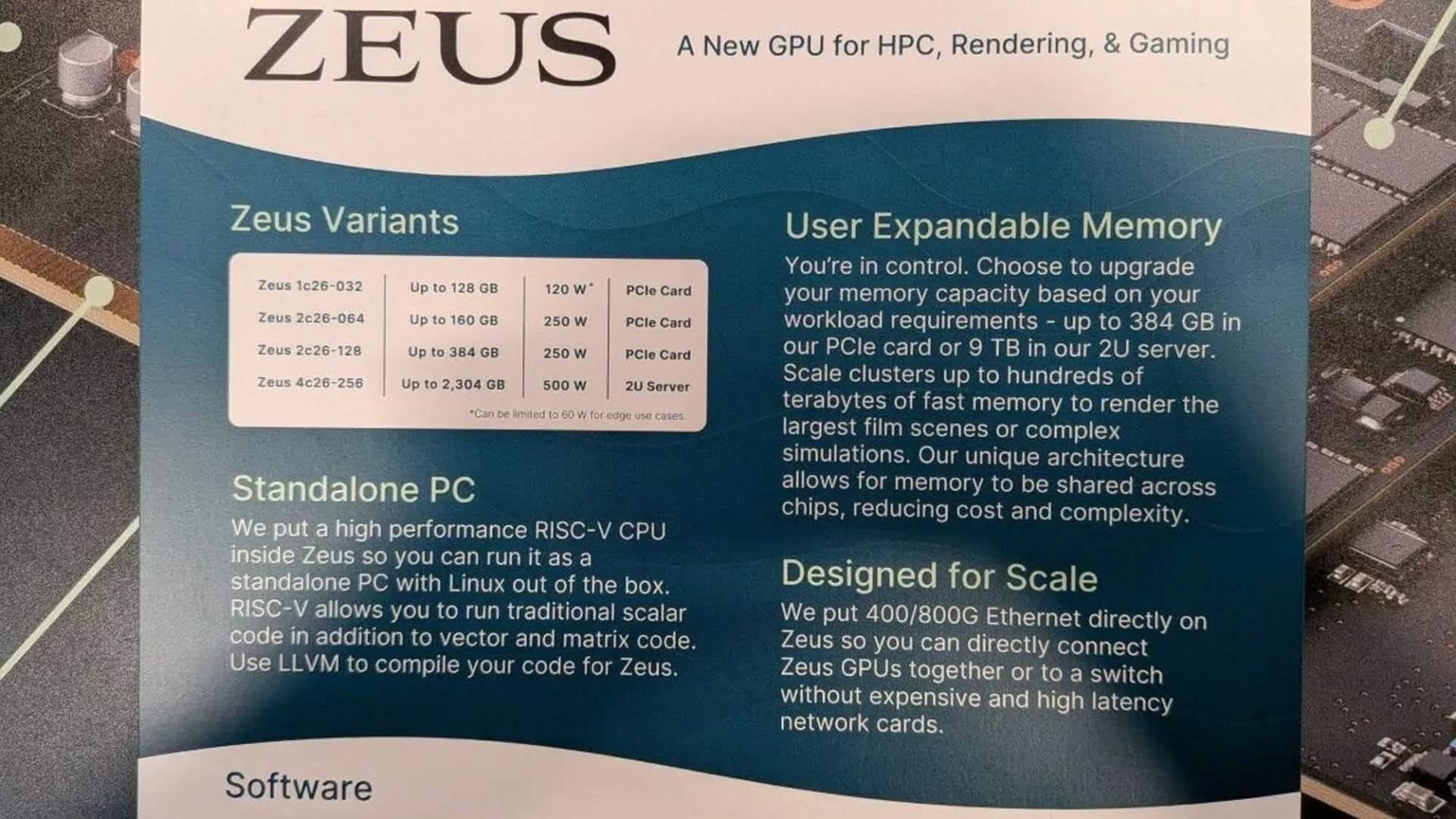 Графические процессоры от Bolt Graphics базируются на фирменной архитектуре Zeus с современным аппаратным конвейером, обеспечивающим растровую графику, трассировку лучей и трассировку пути, и командным процессором RISC-V. Платформа предназначена как для игр, так и высокопроизводительных вычислений и профессиональных задач.