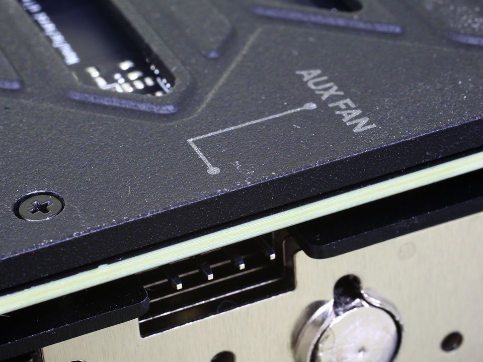 На задней панели платы находится разъем для подключения внешнего вентилятора. Вентилятор работает синхронно с вентиляторами системы охлаждения видеокарты.
