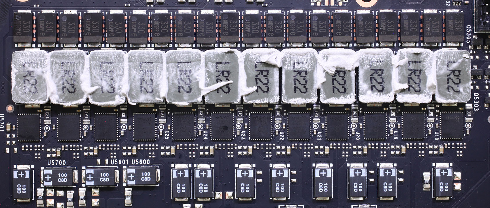 Контроллер IR35201 поддерживает максимум 6 фаз Vcore и 2 фазы SOC. Удвоители IR3599 находятся на обратной стороне платы, а еще один находится спереди, рядом с SOC VRM.