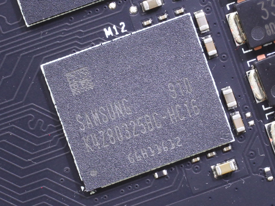 Микросхемы памяти GDDR6 компании Samsung, имеют маркировку K4Z80325BC-HC16. Они предназначены для работы на частоте 2000 МГц (эффективная скорость GDDR6 16 Гбит/с).