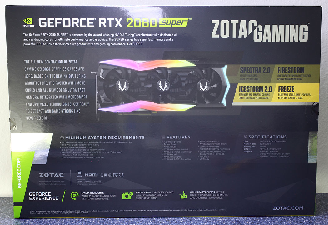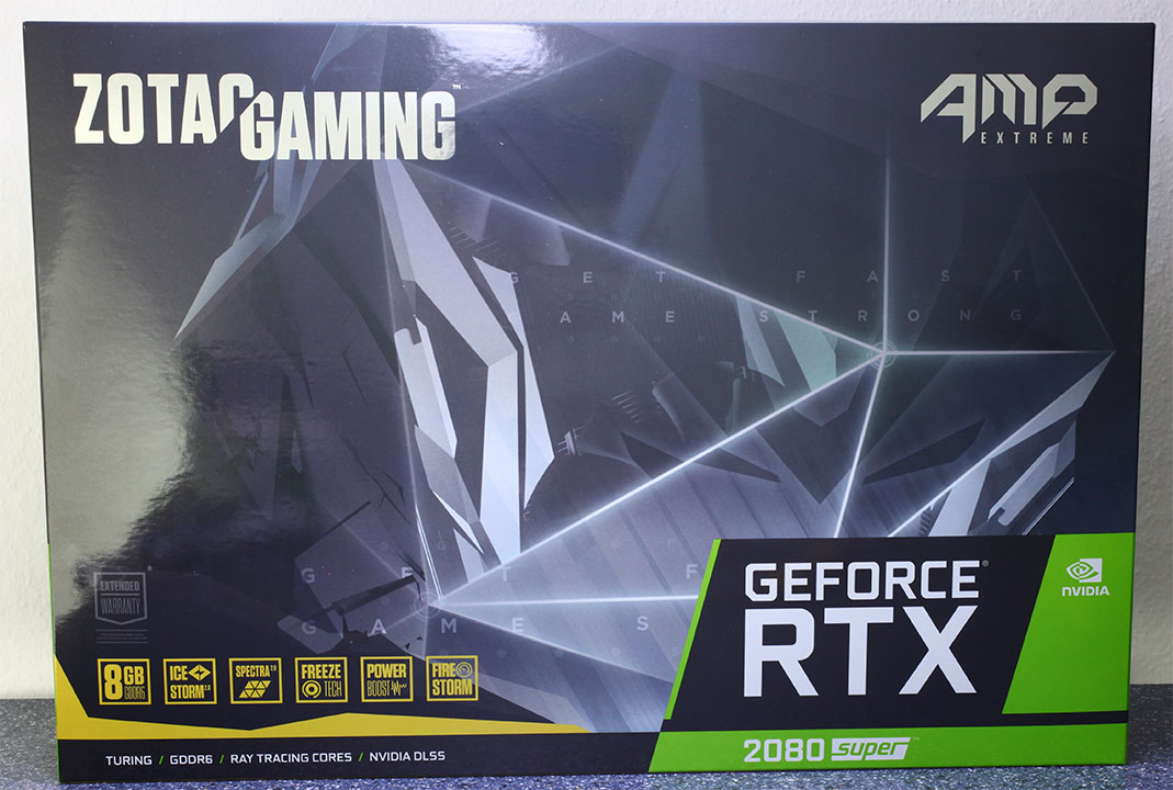 ZOTAC представил GeForce RTX 2080 Super AMP Extreme, видеокарта имеет заводской разгон графического процессора до 1875 МГц, что на 65 МГц больше стандартной частоты, пропускная способность памяти составляет 15,5 Гбит/с. Это единственная видеокарта, на которой установлена система 16+4-фазами питания. Видеокарта питается от двух 8 контактных разъемов питания PCIe. Производитель установил массивную трехслотовую систему охлаждения Ice Storm 2.0, которая оснащена тремя вентиляторами с независимой регулировкой скорости, функцией Fun-Stop и шестью медными тепловыми трубками толщиной 8 мм.