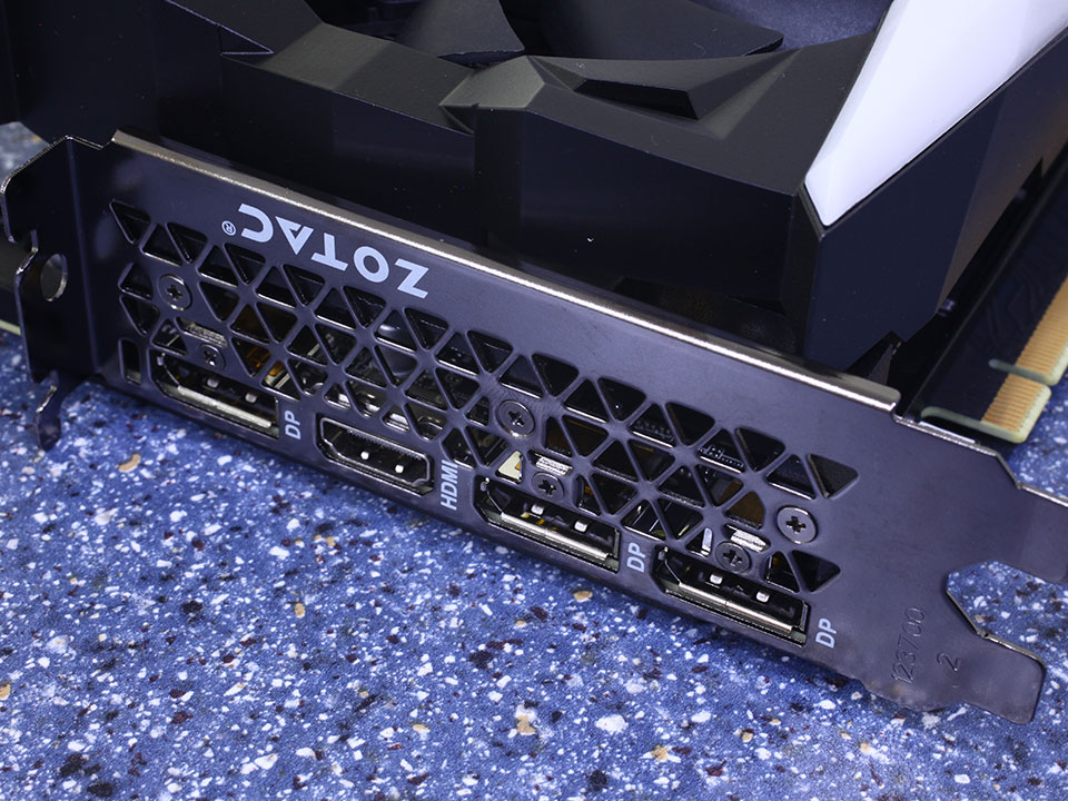 Монитор подключается через один порт HDMI 2.0 и два порта DisplayPort 1.4. По сравнению с Founders Edition один DisplayPort и один разъем USB-C были убраны. Видеокарта поддерживает DisplayPort 1.4a со сжатием потоков (DSC) VESA без потерь.