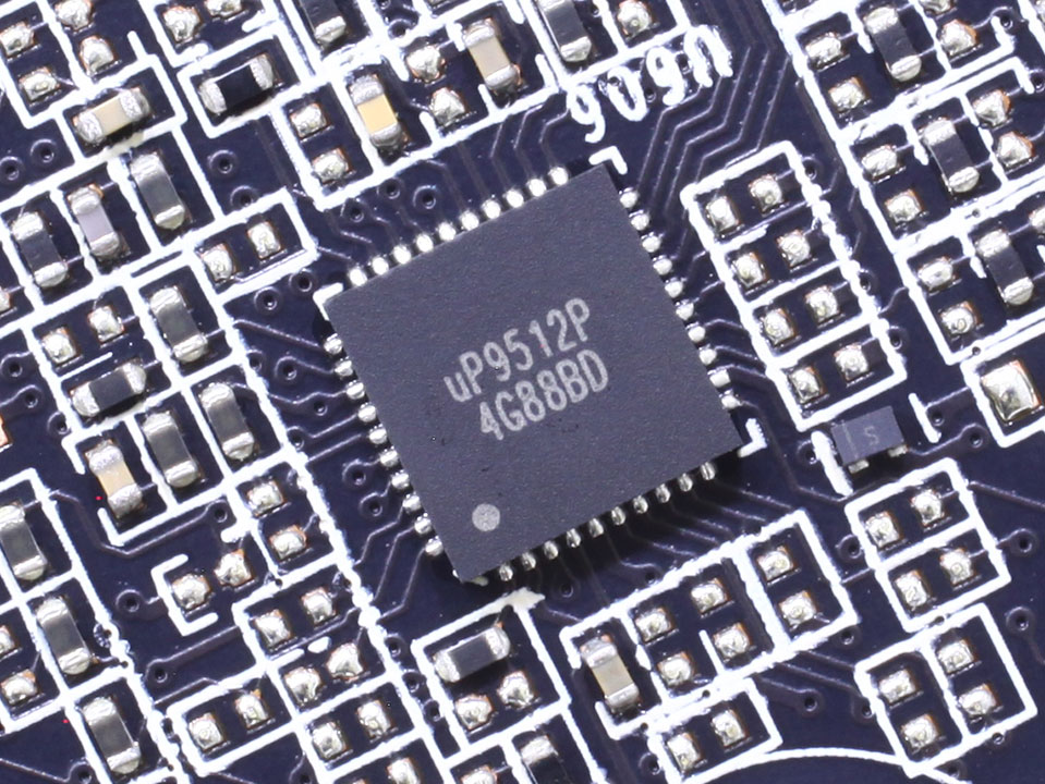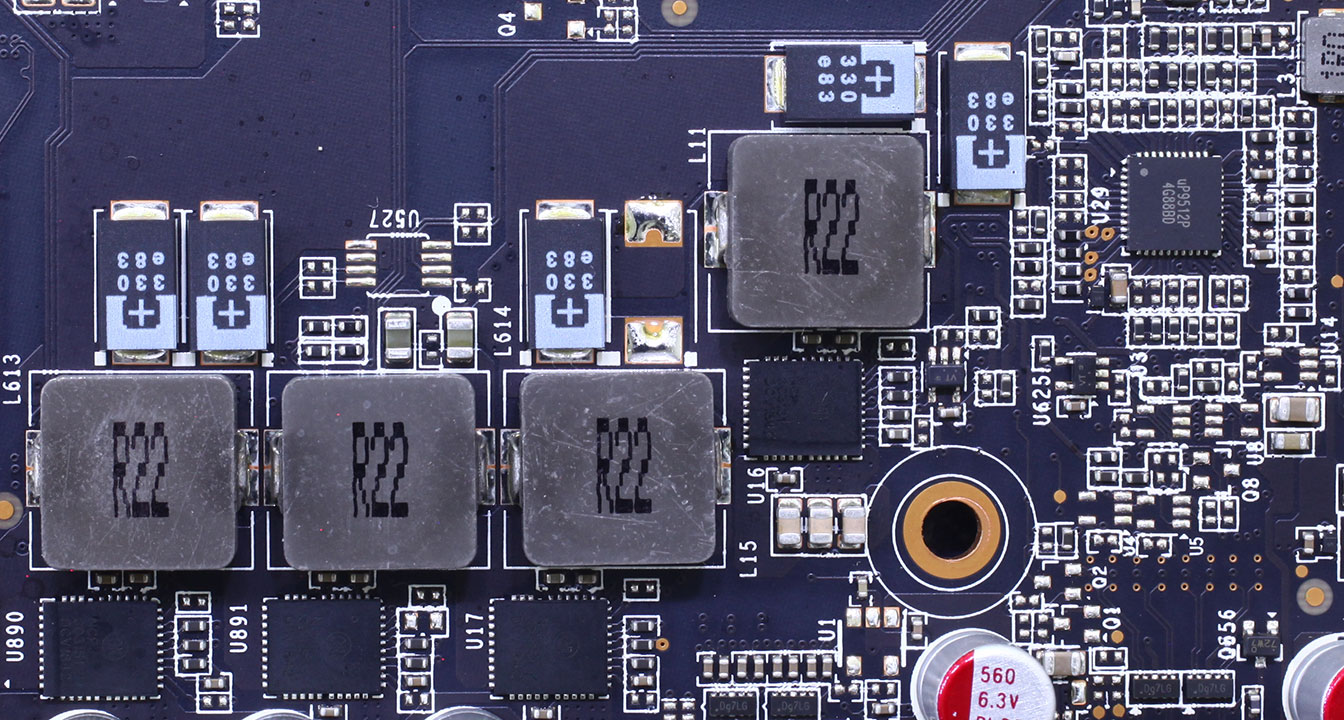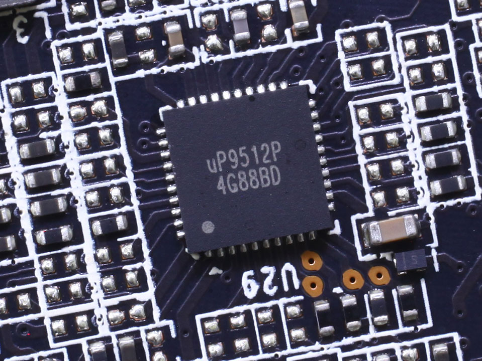 Производитель внес серьезные изменения в систему питания графического процессора, система питания графического процессора получила дополнительные фазы и стала 16-фазной. Напряжение на графическом процессоре управляется контроллером uP9512P.