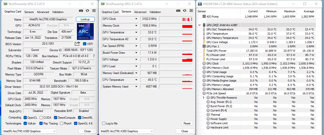 Согласно изображению, которое энтузиаст опубликовал на своей странице в Twitter, максимальная частота графического процессора Intel Arc A380 достигла впечатляющего значения в 3102 МГц — это на 26.6 % больше по сравнению с заявленными производителем максимальными параметрами.