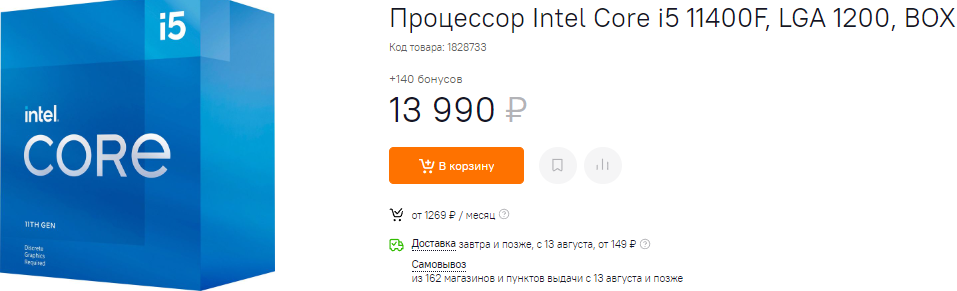 Довольно неплох для истинных фанатов ленивых сборок Core i5 -11400F. Внутри вас ждёт штатный кулер, а запас мощности позволяет не думать об апгрейде много лет. В целом это одни из самых перспективных процессоров, ведь он не только не требовательный, но и может работать с дешёвыми материнскими платами. Ну и видеокарту под него подбирать не нужно, ведь он справится с любым графическими чипами.