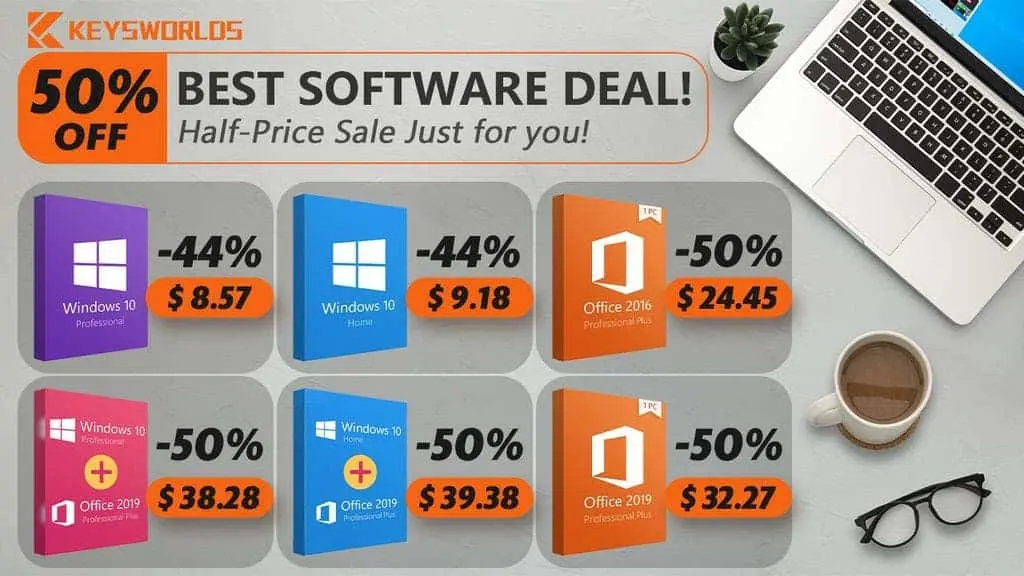 Это лучший шанс обновить систему и пакеты Office. Keysworlds предлагает лучшие цены и невероятные скидки от 44% до 50%. На все программное обеспечение Office действует скидка 50%, а Windows 10 Pro продается по цене всего 5,80 долларов. Пожалуй на данный момент будет трудно найти более выгодные предложения и желающим это сделать стоит поторопиться до того, как акция закончится или будут распроданы все ключи.