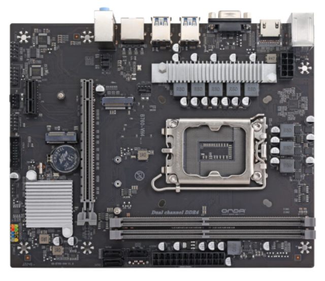 ONDA выпустила две бюджетные материнские платы: B760-VH4-B и B760-VH5-W. Первая модель использует память DDR4, а вторая — DDR5. Присутствует два слота для установки оперативной памяти общим объёмом до 64 ГБ, поддерживаются спецификации DDR4-3600 или DDR5-5600 соответственно, есть поддержка XMP. Платы выполнены в форм-факторе mATX, подсистема питания процессора реализована по схеме 8+1 и даже оснащается радиатором для дополнительного охлаждения. В наличии один слот PCIe x16 и один PCIe x1, два разъёма M.2 PCIe Gen4 x4. Также для подключения устройств хранения есть три порта SATA III. На задней панели присутствуют HDMI и VGA видеовыходы, шесть USB, порт Ethernet, аудио разъёмы и даже порт PS/2.