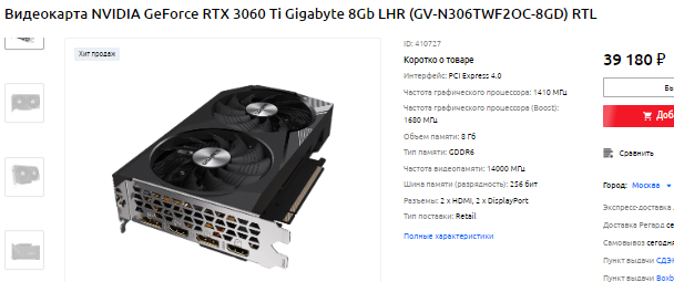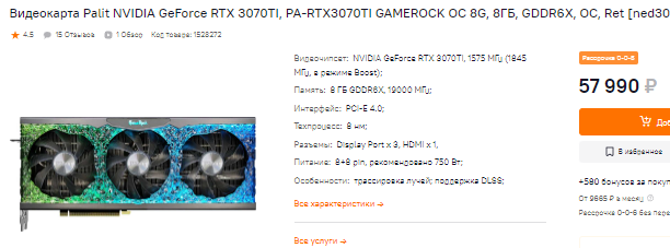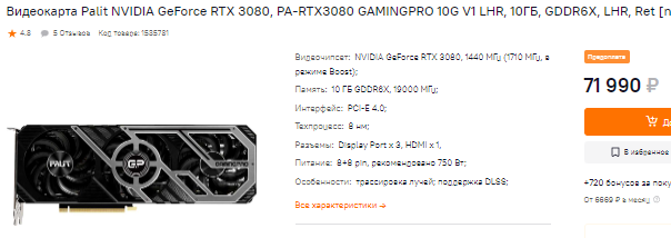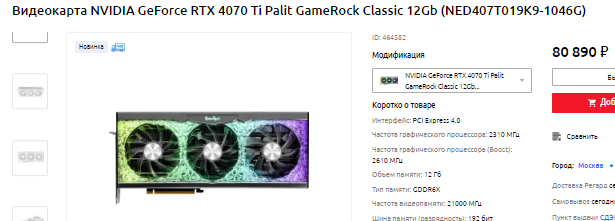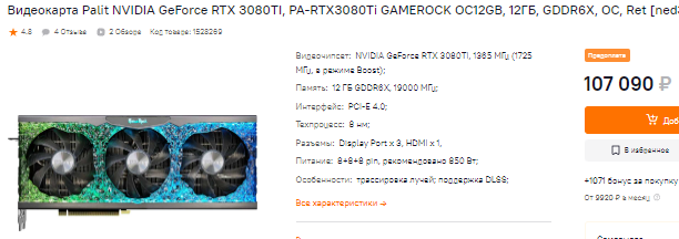 За 107 тысяч в наличии GeForce RTX 3080 Ti, а ведь видеокарта на 15% медленнее указанной выше GeForce RTX 4070 Ti. Мало того, она ещё и дороже, что кажется и вовсе странным. Полный провал, но если у вас есть время, то вы сможете убедиться в том, что точно также неадекватно стоят все флагманы зелёного лагеря предыдущего поколения. На их фоне GeForce RTX 4070 Ti кажется настоящим подарком судьбы, поскольку стоит дешевле, а предлагает более внушительную производительность. Пожалуй, самым главным минусом новинки стоит считать небольшое количество видеопамяти. Дело в том, что внутри всего 12 Гб, а ведь мы говорим о продукте для энтузиастов. В 2023 году хотелось бы увидеть больше.