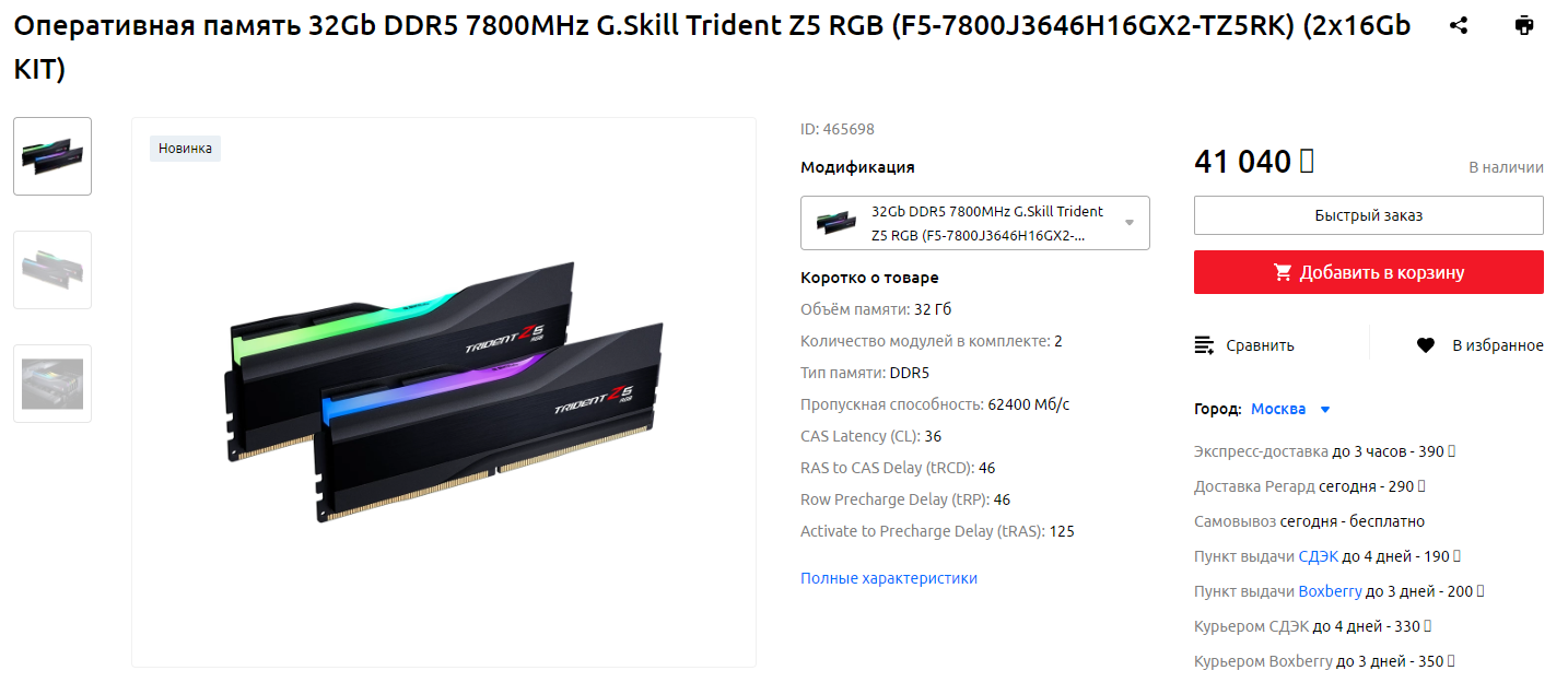 Предлагает «Регард» и комплекты с еще более высокой частотой, и, несмотря на достаточно высокие цены, они наверняка найдут своих покупателей. Так, набор G.Skill Trident Z5 RGB DDR5-7600 16 ГБ x 2 на момент написания данной новости оценивается ритейлером в 37 тысяч рублей, а самый продвинутый в настоящий момент комплект DDR5-7800 16 ГБ x 2 – в 41 тысячу рублей, при этом для двух младших наборов производителем заявлено напряжение 1.4В, а для старшего – 1.45В.