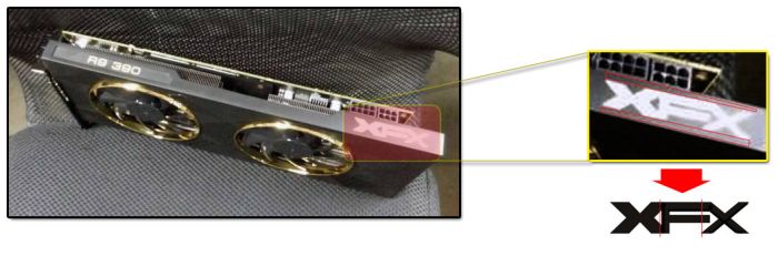 Прежде всего, логотип XFX изображён с искажениями границ средней буквы – она вторгается в пространство, занимаемое последней литерой. На подлинном логотипе такого наложения нет.