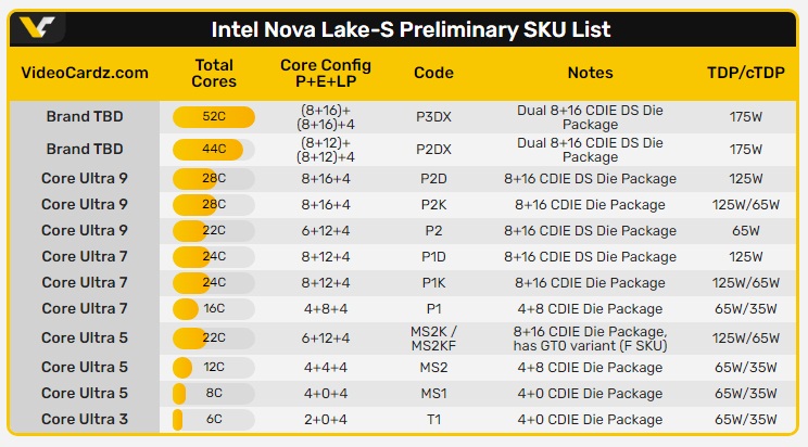 Ожидается, что при выпуске Intel Nova Lake-S будут использоваться как минимум пять вариантов кристаллов, три из которых будут основаны на одной плитке, включая 8-ядерную модель с 4 P-ядрами (4P+0E), 16-ядерную с конфигурацией 4P+8E и 28-ядерную (8P+16E), тогда как два будут представлять собой двухплиточные CPU, в том числе флагманский 52-ядерный (2x(8P+16E)+bLLC) процессор. Все указанные модели будут иметь 4 ядра LP-E.