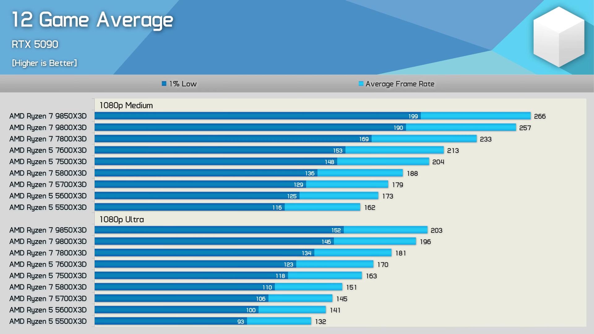Компания AMD представила свои первые игровые процессоры с памятью 3D V-Cache в 2022 году, и с тех пор сменилось несколько поколений Ryzen X3D. Эксперт YouTube-канала Hardware Unboxed решил протестировать девять моделей, принадлежащих к сериям Ryzen 5000X3D, Ryzen 7000X3D и Ryzen 9000X3D, в популярных играх. Тестовая система была оснащена видеокартой GeForce RTX 5090. Для процессоров Ryzen 5000X3D использовалась оперативная память DDR4-3600, а для Ryzen 7000X3D и Ryzen 9000X3D — DDR5-6000.