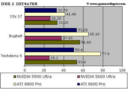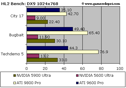 Независимые результаты в тех же условиях не противоречат предоставленным Valve. Более того, на графиках, полученных сайтом gamersdepot.com, мы можем еще отчетливей увидеть значительное падение производительности при переходе от DirectX 8 к DirectX 9 у видеокарт Nvidia и минимальную разницу между этими режимами для видеокарт ATI.
