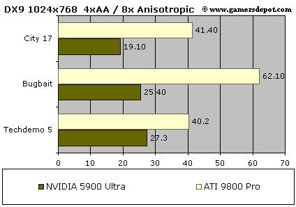 Пока все предельно просто - Radeon 9800 Pro обладает достаточной производительностью для использования полноэкранного сглаживания и анизотропной фильтрации со всеми эффектами DirectX 9, а GeForce FX 5900 Ultra - нет.