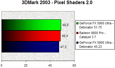 Теперь попытаемся предположить, исправит ли новый Detonator 51.75 ситуацию, взглянув на первые его бенчмарки. Французский сайт clubic.com провел тестирование новых драйверов в тесте Pixel Shader 2.0 бенчмарка 3DMark 2003, являющегося тем самым "слабым местом" видеокарт Nvidia, и получил следующие результаты: