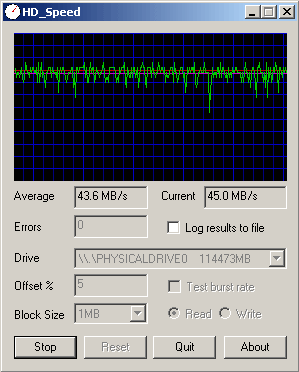 Появилась новая версия крохотной утилиты HD_Speed (13 КБ), обладающей при столь малом размере весьма неплохими возможностями по тестированию быстродействия жестких дисков, а также CD/DVD приводов и дисководов и умеющей строить график скорости чтения/записи, передачи данных через интерфейс: