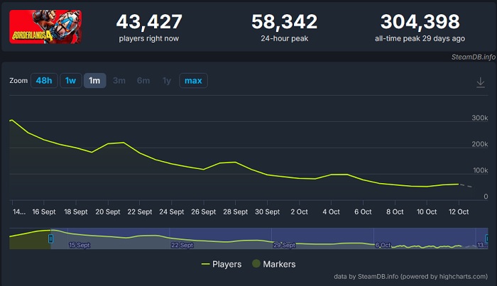 Несмотря на то, что лутер-шутер Borderlands 4 стартовал отнюдь не так плохо, как этого хотели бы геймеры, которых задели необдуманные и даже надменные заявления руководителя студии Gearbox Software Рэнди Питчфорда, статистика «онлайна» у него вполне достойная. Тем не менее, проблема заключается в том, что по прошествии всего месяца с момента релиза заметна отчётливая тенденция её снижения.