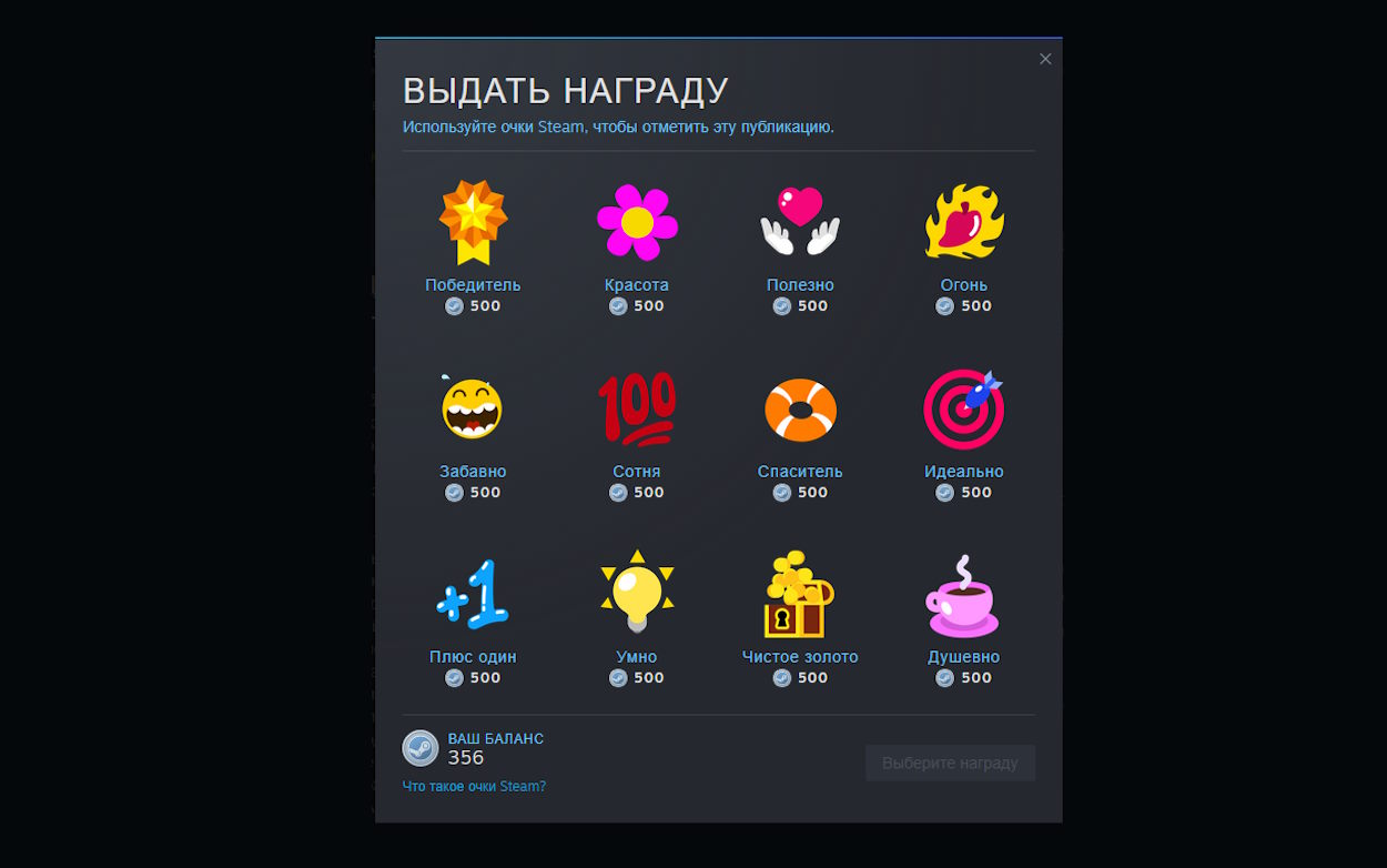 Раньше награды в Steam представляли собой нечто среднее между «лайками» и донатом. Любой пользователь мог выдать награду другому, передавая ему при этом очки, на которые можно было купить контент для профиля Steam. Внешний вид, цена наград и число передаваемых очков отличалось. Минимальная награда стоила 300 очков и передавала пользователю 100 очков.