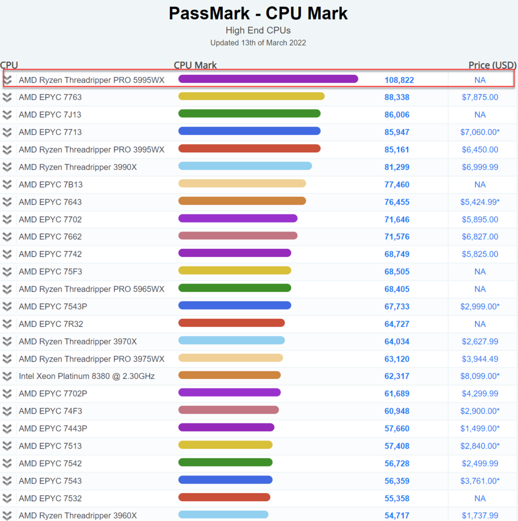 Как вы понимаете, в рамках 7-нм техпроцесса выдавать всё более быстрые процессоры крайне сложно, а особенно демонстрировать огромный прирост производительности, но AMD с честью справилась с таким вызовом. Если сравнивать его с предыдущим флагманом Threadripper PRO 3995WX, то новый Theadripper PRO 5995WX в тесте Passmark оказался на 28% быстрее, что стало настоящей неожиданностью для экспертов. Если говорить о конкретных цифрах, то новинка набрала 108 822 балла, впервые перешагнув планку в 100 тысяч для данного теста. Кстати, новый флагман оказался на 23% быстрее дорогущего серверного EPYC 7763.