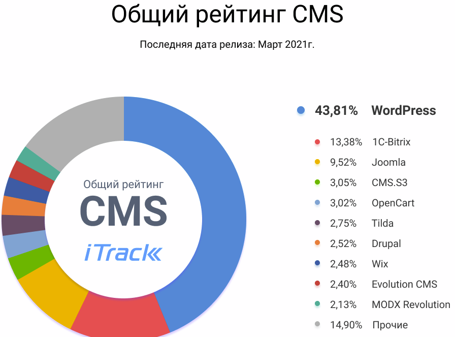 Напомним, компания занимается разработкой систем управления сайтами и считается одной из самых популярных в мире. Если обратиться к данным за 2021 год, то на первом месте была WordPress с показателем 43.81%. «1С-Битрикс» на втором месте с 13.38%, ну на ранее мегапопулярная Joomla только на третьем месте – 9.52%.
