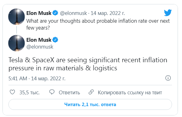 Американский миллиардер Илон Маск (Elon Musk) обычно посвящает связям с общественностью вечера воскресенья, и минувшие выходные не стали исключением, поскольку он со страниц Twitter призвал подписчиков делиться собственными прогнозами по темпам инфляции на ближайшие несколько лет.