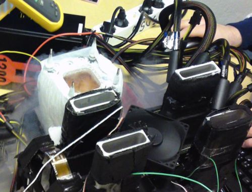 Как вы можете помнить, под этим именем скрывается серьёзно оптимизированный под разгон вариант Radeon HD 5970 с 2 х 2 Гб памяти типа GDDR-5. Связка из двух таких видеокарт увеличивает количество видеочипов в системе до четырёх штук. Компанию им составил разогнанный до частот 5.8-5.9 ГГц шестиядерный процессор Core i7-980X Extreme Edition, а сами видеокарты при помощи жидкого азота были разогнаны до частот 1150/5200 МГц. Система была подключена к двум блокам питания Corsair мощностью по 950 Вт.