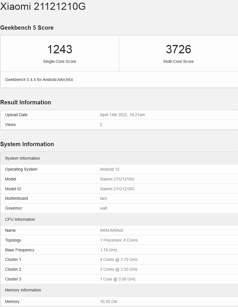 В Geekbench уже обнаружили результаты неизвестного нового устройства Xiaomi, по предположениям, это и есть Poco F4 GT. Устройство под обозначением 21121210G построено на платформе Qualcomm Snapdragon 8 Gen1. Тестировалась версия с 12 ГБ оперативной памяти, она набрала 1243 и 3726 баллов в одно-многоядерном сценариях. На смартфон предустановлена операционная система Android 12, ожидается оболочка MIUI 13.