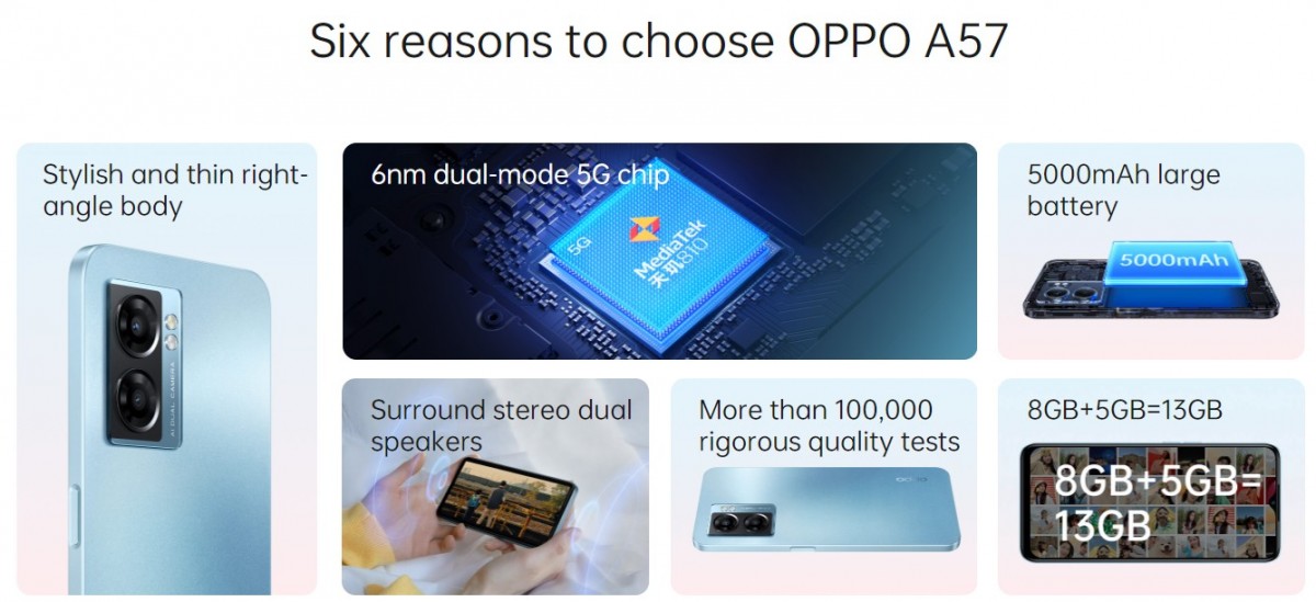 Oppo A57 5G в Китае стоит 1500 юаней за 8/128 ГБ, пишет GSMArena.