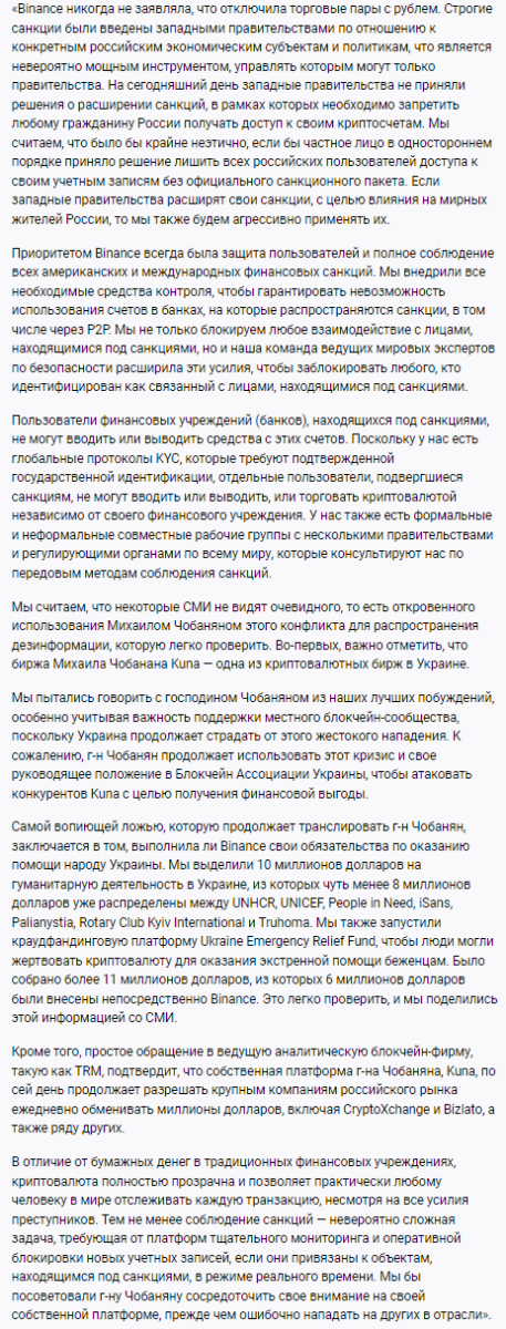 Ниже мы выкладываем скриншоты текста, а здесь кратко ознакомим вас с ситуацией. Так, представители Binance прямо обвинили Михаила Чобаняна в устранении конкурентов с помощью доступных ему рычагов влияния. Якобы, основатель Kuna пытается извлечь финансовую выгоду, обвиняя Binance в работе с российскими компаниями и обычными жителями. К слову, Михаил Чобанян постоянно пишет в различные инстанции и требует полного запрета на работу бирж с гражданами РФ. Но куда любопытнее данные, согласно которым сам Михаил не только не остановил обслуживание крупных российских компаний, но и ежедневно помогает выводить миллионы долларов с помощью доступных ему сервисов.