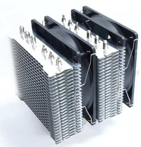 Всю конструкцию обдувают два 120-миллиметровых вентилятора, скорость вращения которых можно регулировать в пределах 300-1400 об/мин. Каждый из них создаёт воздушный поток до 134 куб.м/ч, а уровень шума у каждого составляет 13-28 дБА. Пользователь также может самостоятельно поставить третий вентилятор, чтобы система охлаждения работала ещё эффективнее.
