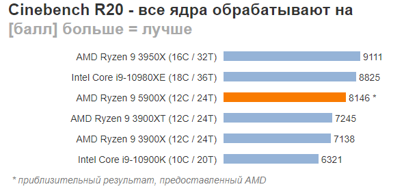 На прошлой неделе AMD представила новую линейку процессоров на архитектуре Zen 3. Одним их ключевых свойств новых чипов назывался резкий прирост IPC, что должно привести к увеличению производительности для одного ядра. Дабы доказать мощь самого быстрого из представленных процессоров – 12-ядерного Ryzen 9 5900X, были показаны тесты в Cinebench R20, где новинка обошла всех конкурентов почти на сотню баллов. Стоит учитывать, что получить в Cinebench R20 лишние 10 баллов – это уже подвиг, а здесь у нас преимущество в невероятные 90 баллов.