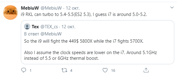 Пока известно, что в новой линейке максимальная тактовая частота составит 5 ГГц, но известный в узких кругах специалист и инсайдер @MebiuW сообщает, что модели Core i9 смогут повышать частоту в турбо-режиме до 5,4…5,5 ГГц, частота инженерных образцов ES2 достигает 5,3 ГГц. Это позволяет предположить, что границы частот для моделей Core i7 также будут расширены и достигнут 5,2 ГГц.