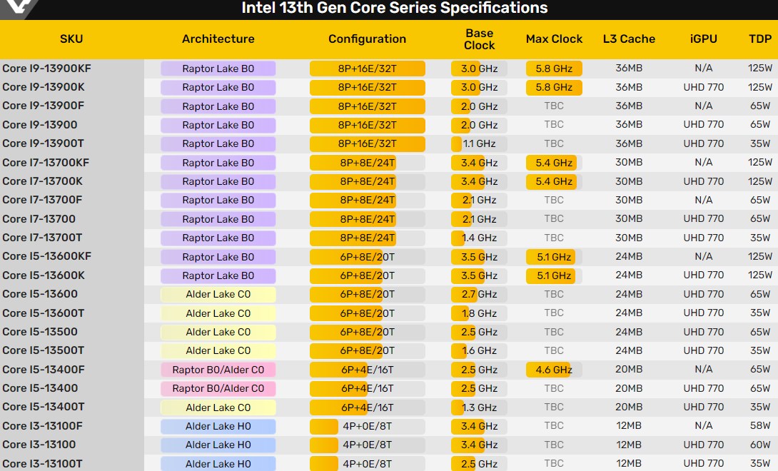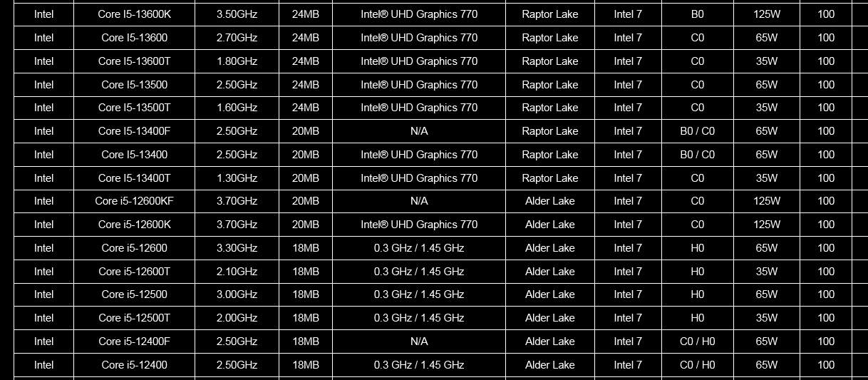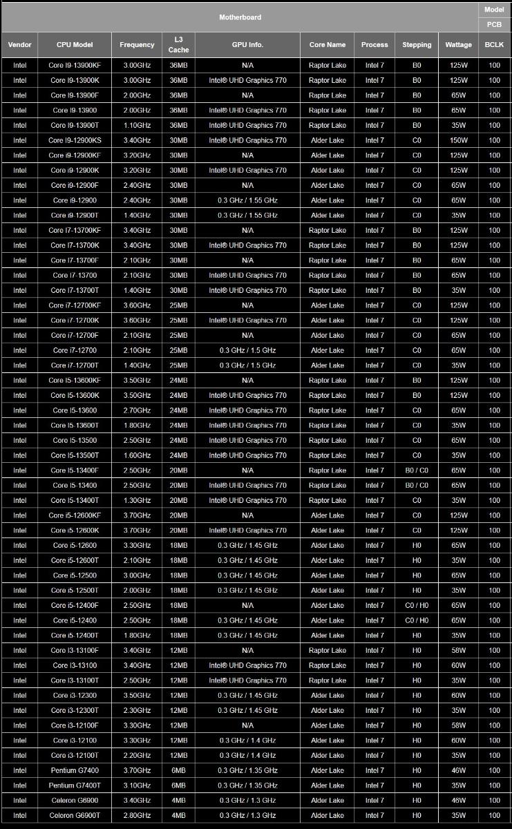 Intel еще предстоит официально представить все свое семейство процессоров Core 13-го поколения, но Gigabyte уже опубликовала некоторые из их спецификаций, включая базовые частоты, объем кэш-памяти, мощность и степпинг, в своем списке поддерживаемых процессоров материнской платы Z790 Aorus Master, найденном инсайдером @momomo_us.