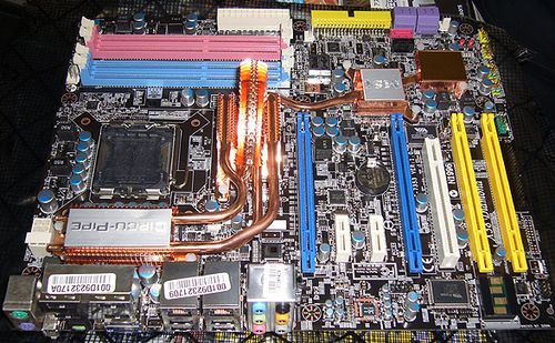 Как можно заметить, на этой материнской плате четыре слота PCI Express x16. Как поясняет производитель, два синих слота работают по формуле "PCI Express x16 + PCI Express x16", при этом скорость передачи данных соответствует спецификациям PCI Express 2.0.