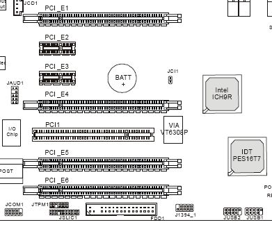 Два жёлтых слота для установки видеокарт с интерфейсом PCI Express x16 соответствуют спецификациям PCI Express 1.x, и при этом работают по формуле "PCI Express x4 + PCI Express x4". Рядом размещён специальный чип-коммутатор IDT PES16T7, управляющий режимом работы жёлтых слотов PCI Express x16. Кроме того, на плате есть два слота PCI Express x1 и один слот PCI.