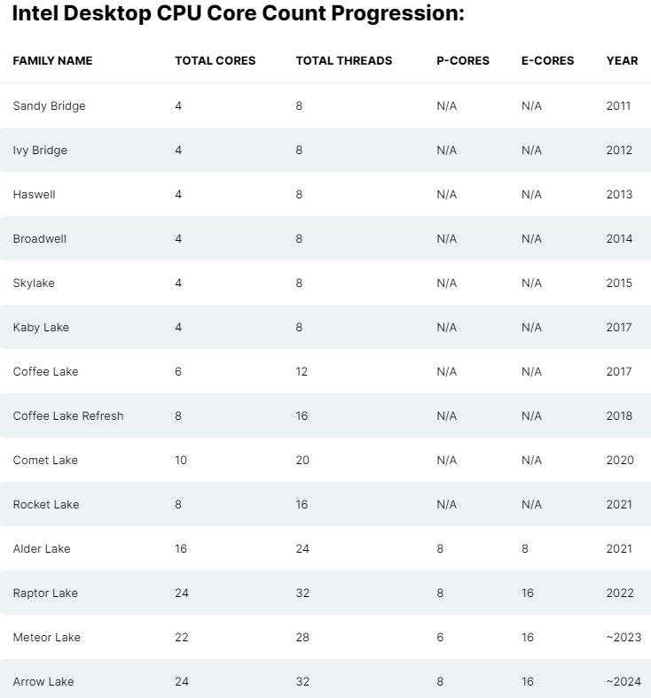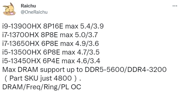 Мобильные процессоры Core i7-13650HX и Core i5-13500HX, по данным информатора, получат по 6 P- и 8 E-ядер, а их максимальная частота составит 4.9 и 4.7 ГГц соответственно, в то время как младшая из представленных моделей, Core i5-13450HX, обзаведётся 6 «большими»/4 «малыми» ядрами и будет характеризоваться частотой в 4.6 ГГц в boost-режиме.