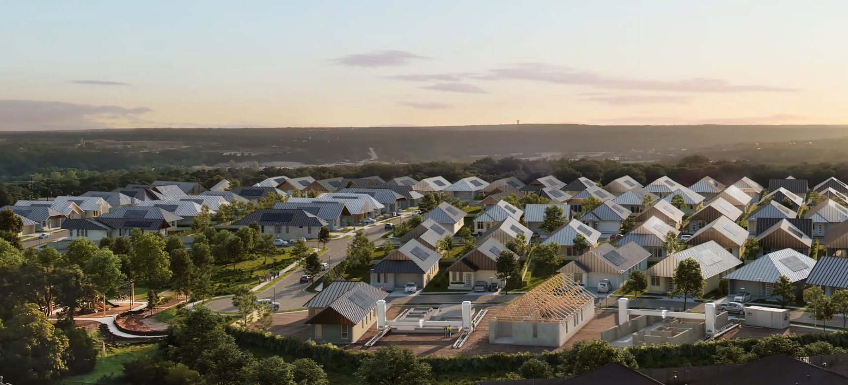 100 домов Genesis Collection at Wolf Ranch печатаются на месте принтерами Vulcan компании Icon с использованием запатентованной цементоподобной смеси. Icon