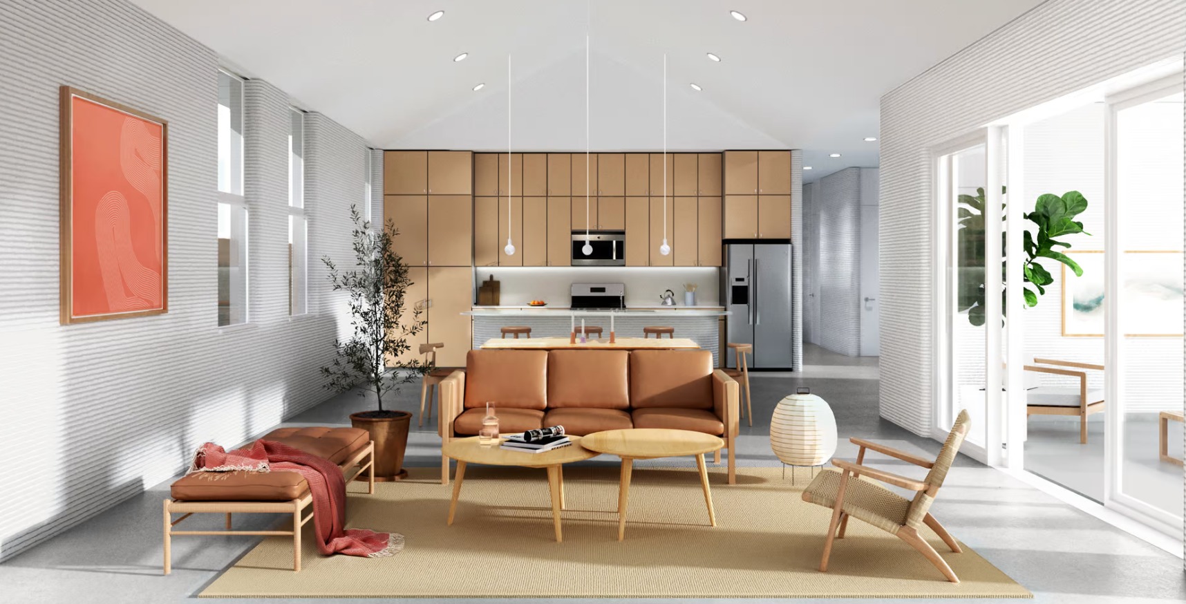 Всего будет восемь различных вариантов домов площадью от 146 до 196 кв. м. Дома будут располагаться на одном уровне. В них будет предусмотрено три или четыре спальни и до четырех ванных комнат. Дизайн района выполнен под влиянием традиционных техасских ранчо. Интерьеры, (если судить по рендерам), выглядят уютными и наполненными светом, а характерные ребристые стены свидетельствуют о том, что они напечатаны на 3D-принтере, а не построены традиционными методами.