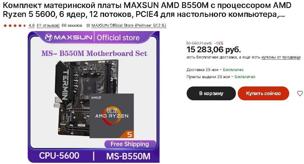 С промокодом от продавца мы сможем приобрести данный камень в комплекте с материнской платой на B550M за 14,600 рублей. Материнская плата от китайского бренда «Maxsun», модель Terminator. Данная плата имеет хорошее охлаждение системы питания, поддержку m2 накопителя, 2 слота DDR4 памяти с поддержкой частот до 3,800 МГц и также имеется поддержка PCI 4.0.