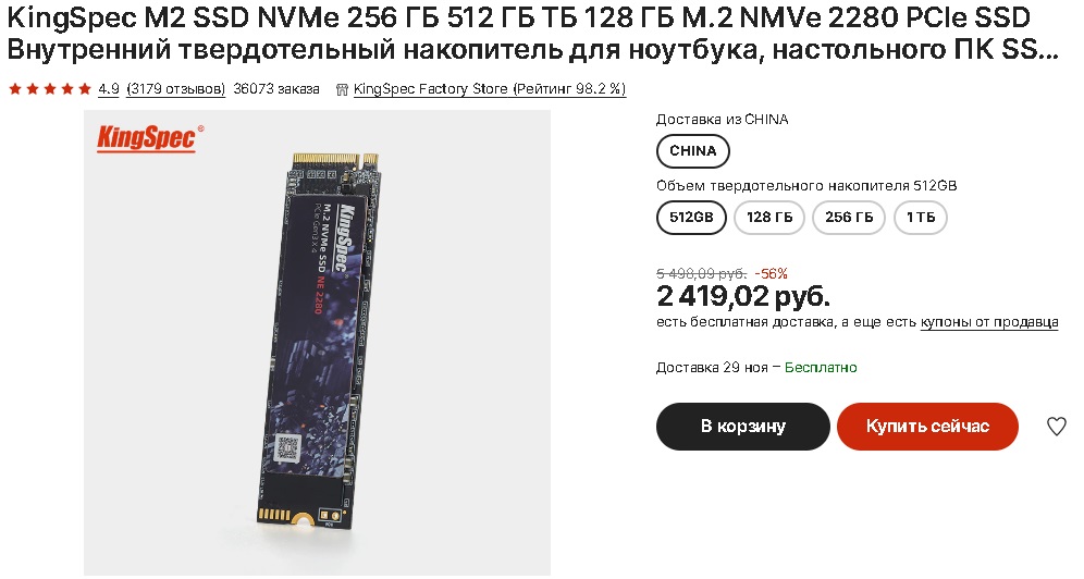 Такого объёма памяти хватит и на систему, и на рабочие программы, чьё нахождение желательно на основном накопителе. С дополнительной скидкой данный М2 накопитель обойдётся в 2,200 рублей.