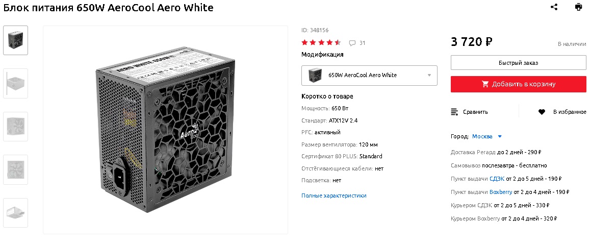 В качестве сердца компьютера, оптимальным решением станет 650W блок питания Aero White