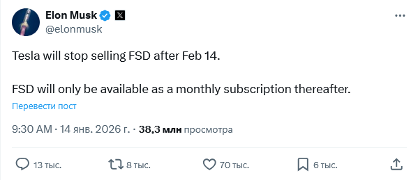 Генеральный директор Tesla Илон Маск объявил, что программное обеспечение Full Self-Driving (FSD) от производителя электромобилей будет доступно только по ежемесячной подписке, начиная с 14 февраля. Маск поделился новостью через свой микроблог X, не предоставив дополнительных подробностей.