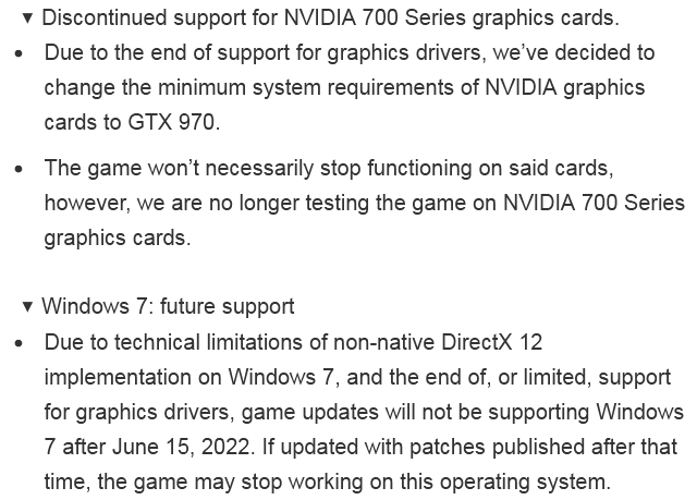 Во-вторых, технические ограничения Windows 7, вызванные отсутствием встроенной поддержки графического API DirectX 12, вынуждают разработчиков отказаться от поддержки операционной системы после 15 июня этого года. В данном случае также не говорится, что игра обязательно перестанет работать при первом же обновлении после этой даты, но вероятность этого есть, в таком случае возвращать работоспособность уже никто не будет.