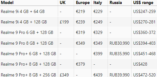 В дополнение к упомянутым моделям, будут варианты Realme 9 Pro+ с 6 ГБ ОЗУ и 128 ГБ и 8 ГБ ОЗУ и 256 ГБ по цене 350–370 евро (396–418 долларов) и 390–420 евро (441–475 долларов) соответственно. Источник также раскрывает цвета европейской модели Realme 9i: Prism Black или Prism Blue, а Pro версии будут выпущены в цветах Aurora Green, Midnight Black и Sunrise Blue.