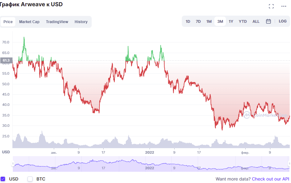 Хуже всех дела идут у Arweave. Стоит учитывать, что это личное мнение аналитиков, поэтому вы вполне можете думать иначе. Разработчики Arweave ставят перед собой амбициозные цели. По их мнению, господству гигантов типа Google, Microsoft и Amazon пора положить конец. Если у вас много свободного времени, почитайте, как они планируют это сделать. К сожалению (или к счастью), пока результатов нет, а курс Arweave продолжает ставить анирекорды.