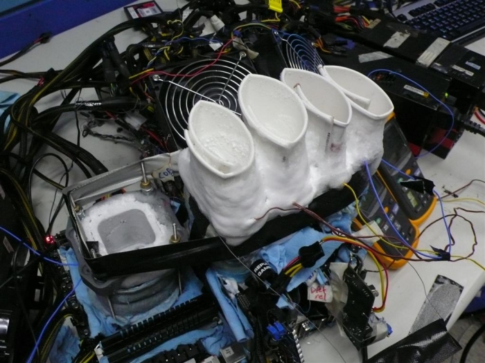 Выжать больше из флагманов NVIDIA удалось другому не менее знаменитому оверклокеру, AndreYang. Подсистема питания GeForce GTX Titan не способна обеспечить стабильную работу видеокарты при высоких значениях напряжений, поэтому проблема была решена радикально: необходимый модуль был позаимствован у графического ускорителя Radeon HD 7970 Matrix. В создании "зомби" также принимал участие профессиональный оверклокер Shamino.