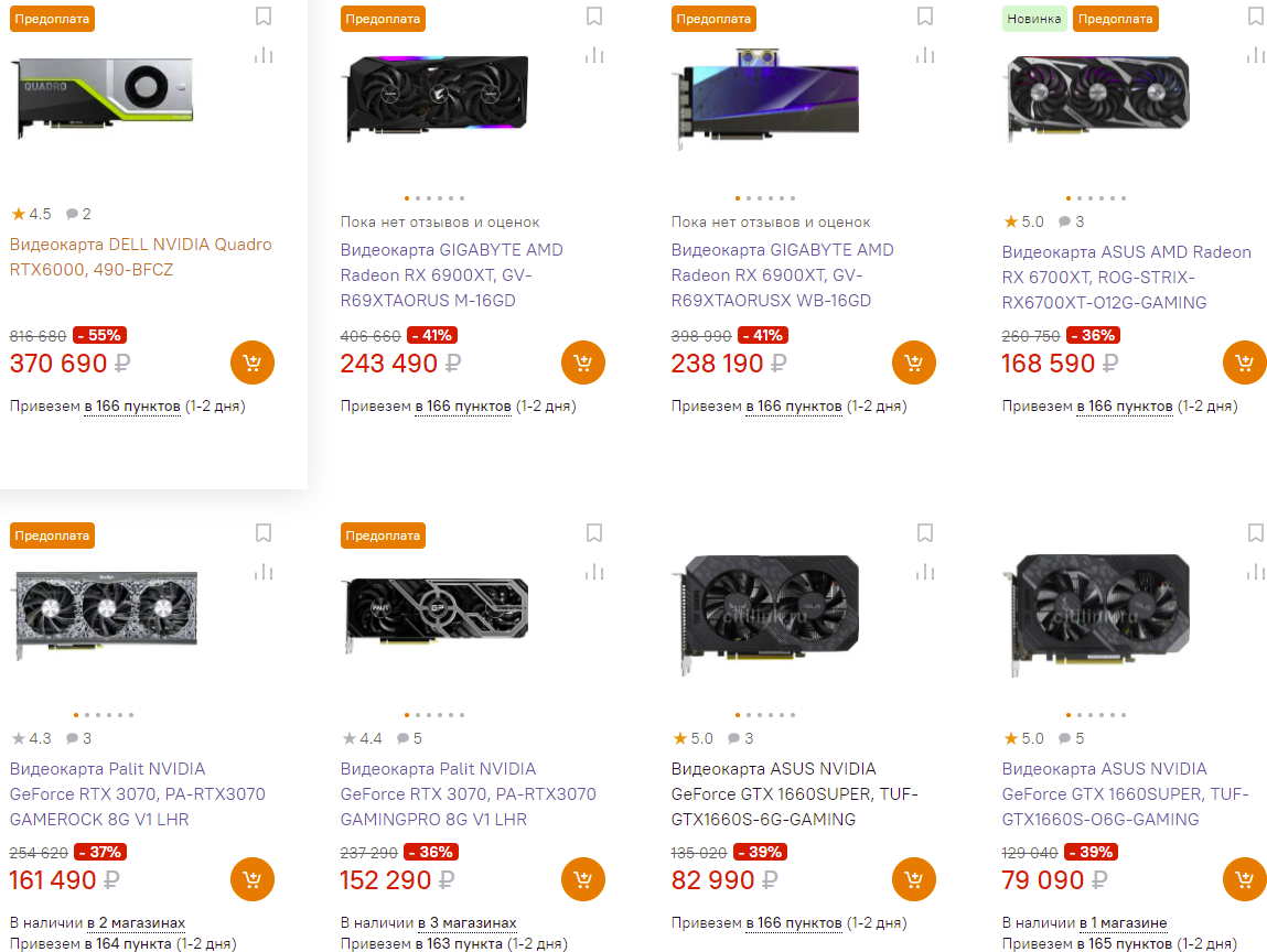 Ну и на сладкое GeForce GTX 1650. Мы ещё помним, как эта видеокарта стоила 23 тысячи рублей, а значит у нас почти двухкратное увеличение цены. Если сравнивать её с более скоростными GeForce RTX 3080 и Radeon RX 6900 XT, то последние кажутся намного выгоднее, поскольку подорожали на 60%.