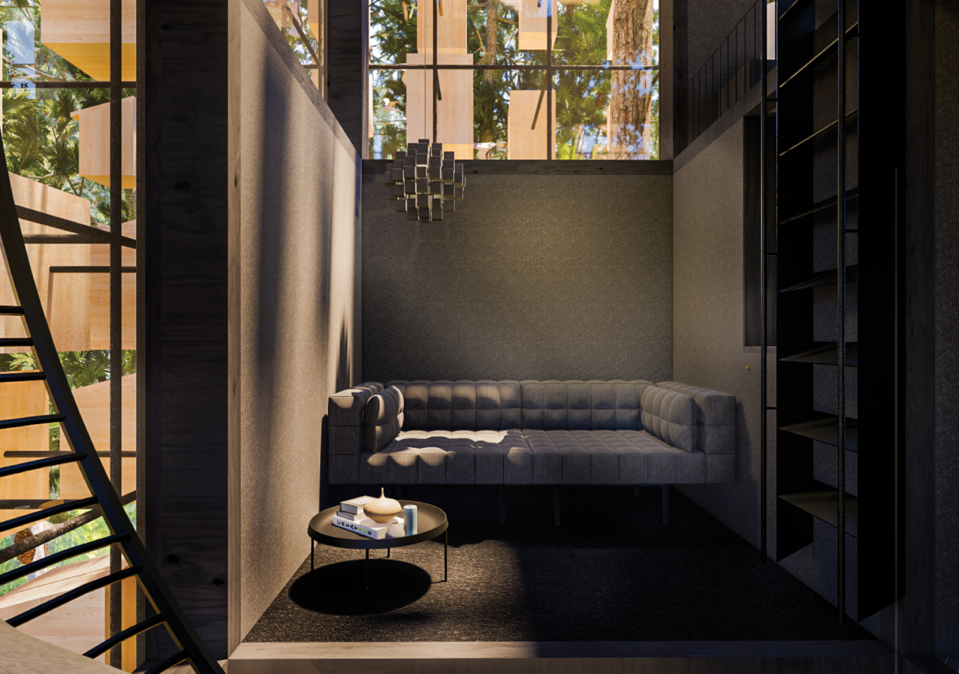 Мини-отель будет установлен на растущих соснах в удаленном лесном массиве, а доступ к нему будет осуществляться по подвесному мосту. Внешняя часть здания будет полностью застеклена, но дизайн будет дополнен деревянными скворечниками разных размеров и форм, специально подобранными для птиц разных видов.