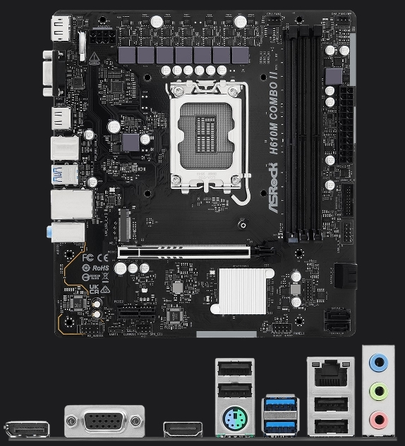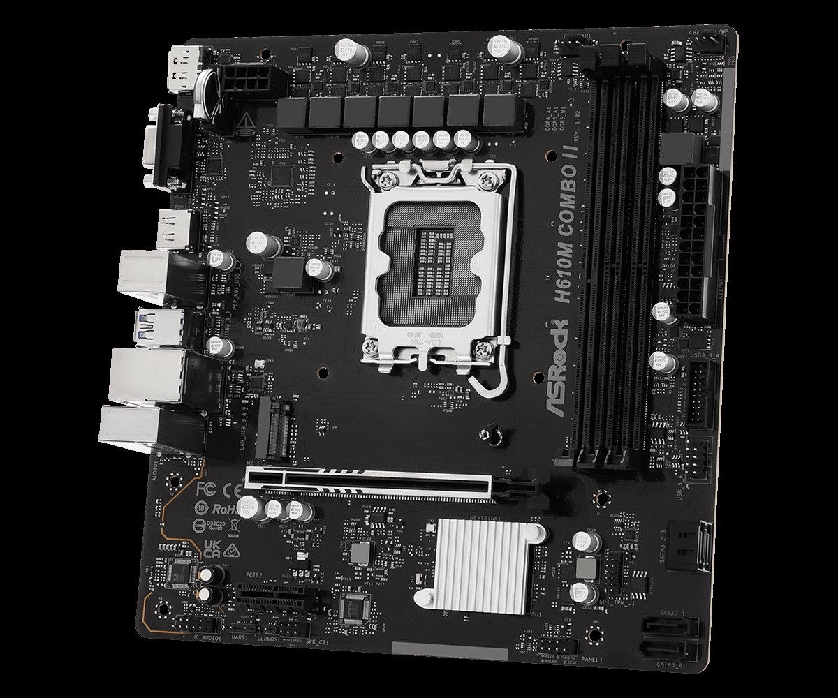 ASRock H610M COMBO II выпускается в формате microATX, основана на чипсете начального уровня H610, имеет 6+1+1-фазную систему питания VRM и совместима с процессорами Intel Core 12-го, 13-го и 14-го поколения. Новинка предлагает один слот PCIe 5.0 x16, один разъём PCIe 3.0 x1, один слот M.2 Gen 3.0 для NVMe SSD, четыре порта SATA3, гигабитный порт Ethernet и несколько USB.