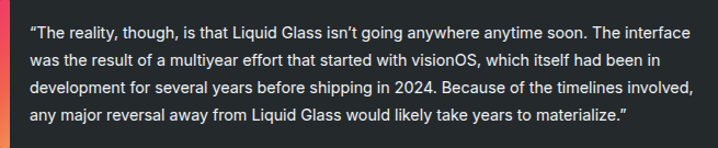 Известный обозреватель Марк Гурман пишет, что Apple ни в коем случае не станет откатывать Liquid Glass, поскольку это как минимум потребует много времени. Впервые данный стиль появился в visionOS, которая разрабатывалась за несколько лет до своего анонса в 2024 году, и отказ от него занял бы годы работы, что неприемлемо для Apple. Руководство внутри компании и дизайнеры в едином порыве поддержали инновацию, и нет ни одного доказательства того, что кто-либо выступил против.